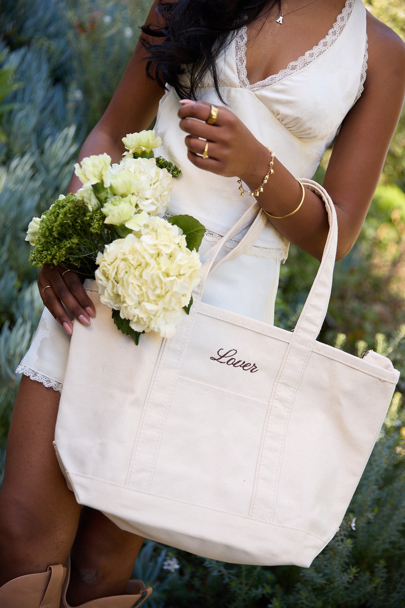 The Lover Tote is your wedding-day catch-all—minimal, soft, and made to hold every essential without sacrificing style. Designed in a clean canvas with subtle embroidery, it slips effortlessly into bridal mornings, travel days, or everyday errands. Think “getting ready bag,” airport carry-on, and honeymoon staple all in one.