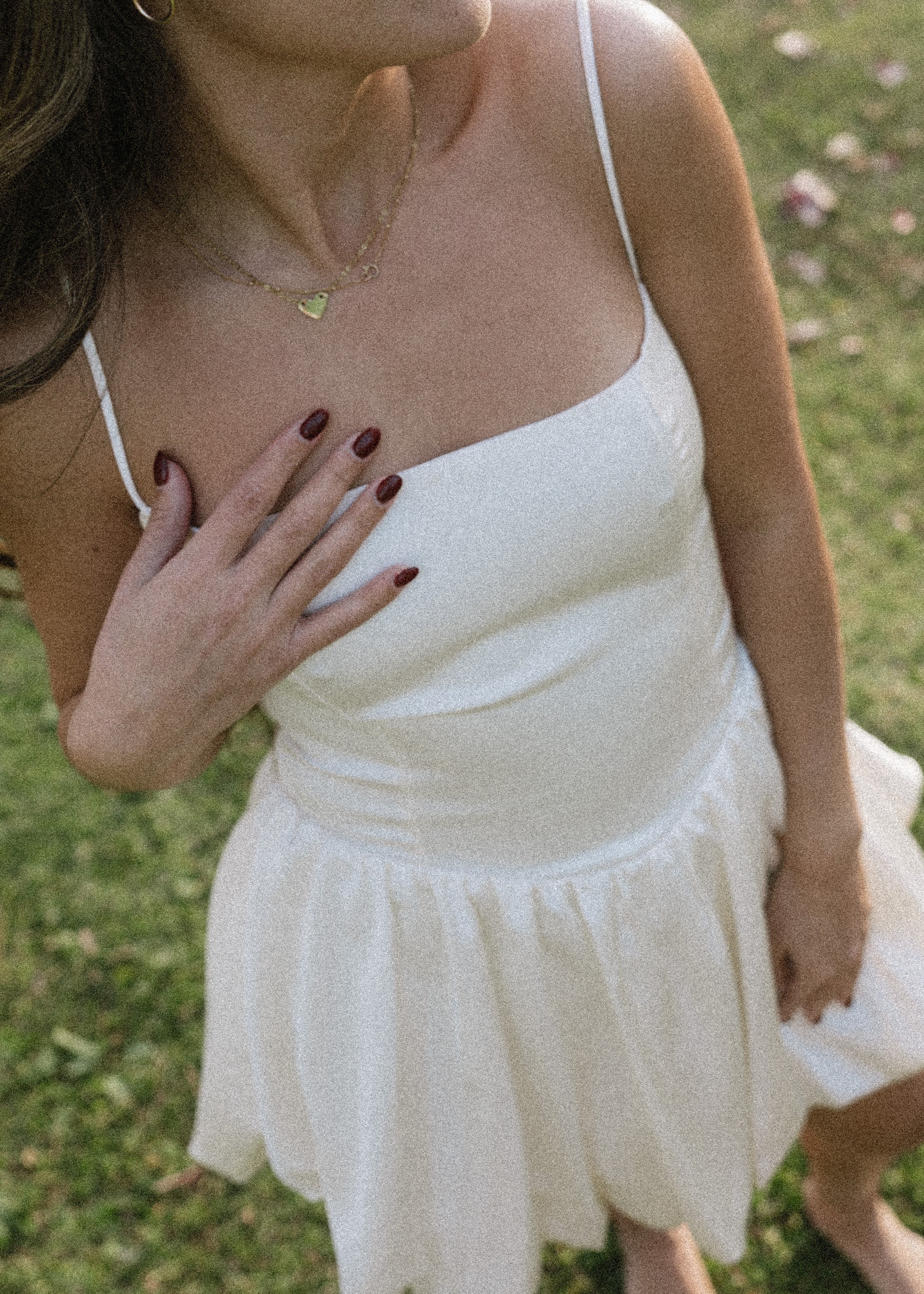 The Olivia Dress was made for twirling through wedding festivities. With a fitted bodice and floaty pleated skirt, it’s perfect for your engagement party, shower, or spinning barefoot at your reception’s last dance.